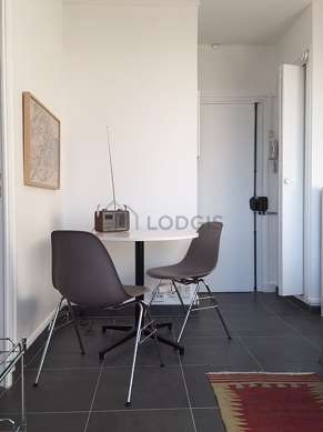 SalónEste apartamento está formado por un salón con azulejo en el suelo una vista a la calle. Este salón muy tanquilo está amueblado y equipado para que su estancia sea agradable : televisor, edredones, mesa, estantería, armario empotrado, 1 silla(s), mesita de noche, floor lamp, coat stand1 sofá cama.