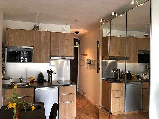 Este apartamento posee una magnífica cocina con parquet en el sueloy todo el equipamiento esencial para su vida diaria : placas eléctricas, refrigerador, micro ondas, congelador, campana extractora, cafetera, mesa, estantería, vajilla, 1 silla(s).