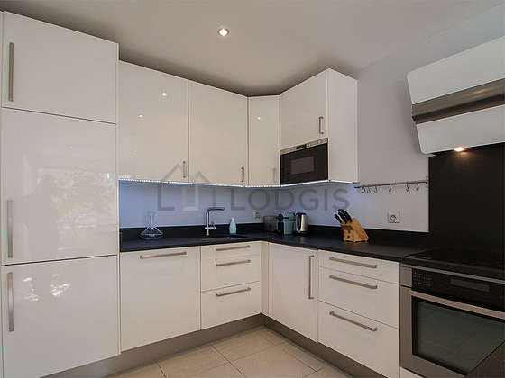 Este apartamento posee una magnífica cocina con parquet en el sueloy todo el equipamiento necesario para su vida diaria : placas eléctricas, refrigerador, congelador, horno, micro ondas, campana extractora, tostador, hervidor, cafetera, armario empotrado, vajilla, taburete, bar.