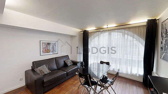 Este apartamento está formado por un salón con parquet en el suelo una vista a la calle. Este salón muy tanquilo está amueblado y equipado para que su estancia sea agradable : televisor, sofá, mesa, estantería, 4 silla(s), taburete.