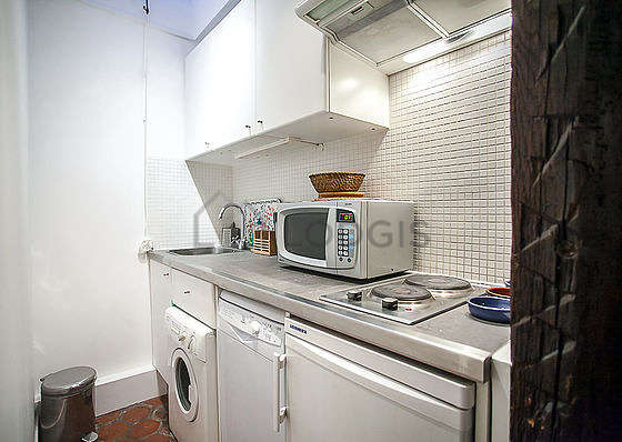Este apartamento posee una cocina con terrazo en el sueloy todo el equipamiento indispensable para su vida diaria : refrigerador, micro ondas, congelador, tostador, cómoda.