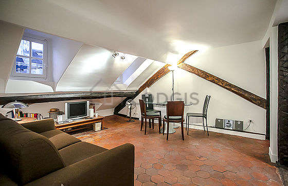 SalónEste apartamento está formado por un salón con terrazo en el suelo y ventanas. Este salón está amueblado y equipado para que su estancia sea agradable : televisor, sábanas, sofá, mesa, viga, 1 silla(s)1 sofá cama.