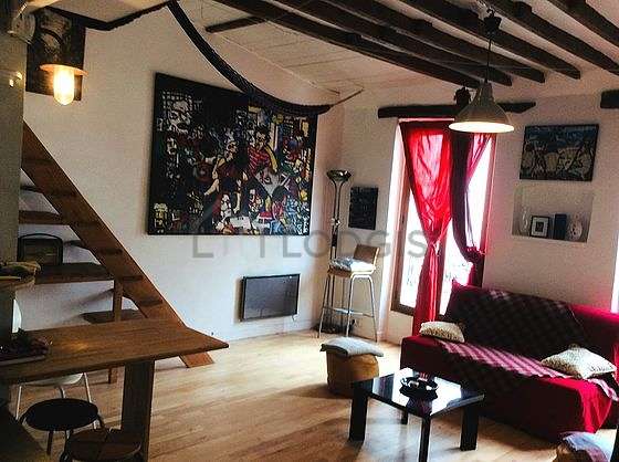 Este apartamento está formado por un salón con parquet en el suelo y ventanas doble acristalamiento. Este salón tranquilo está amueblado y equipado para que su estancia sea agradable : televisor, sábanas, edredones, sofá, mesa, ropero, biblioteca, estantería, cómoda, vajilla, 1 silla(s), taburete, bar, airer, floor lamp, mirror, coat stand, pouffe, painting, vase1 sofá cama.