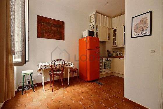 Este apartamento posee una bonito cocina con azulejo en el sueloy todo el equipamiento necesario para su vida diaria : placas eléctricas, refrigerador, horno, micro ondas, tostador, hervidor, cafetera, mesa, estantería, armario empotrado, 1 silla(s), taburete.