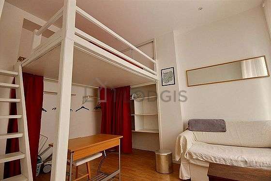 SalónEste apartamento está formado por un salón con parquet en el suelo y ventanas. Este salón muy tanquilo está amueblado y equipado para que su estancia sea agradable : sofá, mesita, mesa de estudio, ropero, estantería, armario empotrado, 1 silla(s), mesita de noche, mirror, painting1 cama en altura.