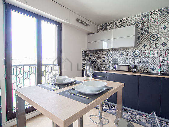Este apartamento posee una magnífica cocina con parquet en el sueloy todo el equipamiento indispensable para su vida diaria : placas eléctricas, refrigerador, congelador, horno, micro ondas, campana extractora, tostador, hervidor, cafetera, mesa, estantería, armario empotrado, vajilla, taburete.