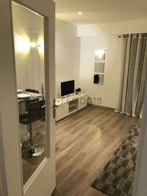 SalónEste apartamento está formado por un salón con parquet en el suelo y ventanas. Este salón está amueblado y equipado para que su estancia sea agradable : televisor, sofá, mesita, armario, tv stand, mirror, painting, carpet1 sofá cama.