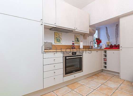 Este apartamento posee una magnífica cocina con azulejo en el sueloy todo el equipamiento necesario para su vida diaria : placas eléctricas, refrigerador, horno, micro ondas, campana extractora, hervidor, cafetera, armario empotrado, vajilla.