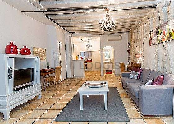 Este apartamento está formado por un salón con azulejo en el suelo y ventanas. Este salón tranquilo está amueblado y equipado para que su estancia sea agradable : televisor, 1 sillones, mesa, mesita, mesa de estudio, biblioteca, piedras aparentes, viga, 5 silla(s), floor lamp, lamp, chandelier, tv stand, painting, carpet.