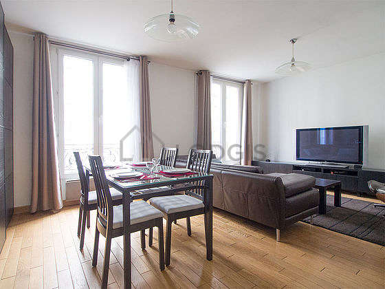 Este apartamento está formado por un salón con parquet en el suelo y ventanas. Este salón muy tanquilo está amueblado y equipado para que su estancia sea agradable : televisor, 1 sillones, mesa, mesita, ropero, biblioteca, armario empotrado, 4 silla(s), chandelier, curtains, carpet.