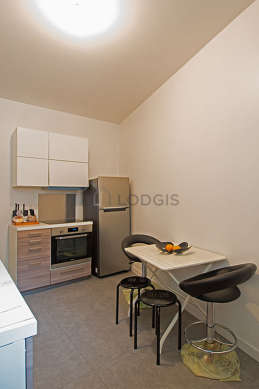 Este apartamento posee una bonito cocina con azulejo en el sueloy todo el equipamiento necesario para su vida diaria : placas eléctricas, refrigerador, congelador, horno, micro ondas, campana extractora, tostador, hervidor, cafetera, mesa, armario empotrado, vajilla, 2 silla(s), taburete.