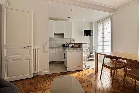Este apartamento está formado por un salón con parquet en el suelo y ventanas. Este salón muy tanquilo está amueblado y equipado para que su estancia sea agradable : televisor, sofá, mesa, 1 silla(s).