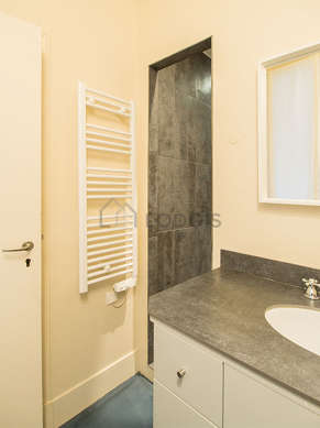 Este apartamento tiene una sala de baño magnífica. Este baño tiene todo lo necesario para su bienestar diario : armario empotrado, ducha, sink, radiador seca-toallas. El WC está integrado en la sala del baño.