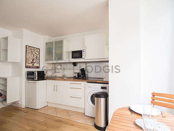 Este apartamento posee una magnífica cocina con azulejo en el sueloy todo el equipamiento indispensable para su vida diaria : placas eléctricas, refrigerador, horno, micro ondas, tostador, hervidor, cafetera, mesa, estantería, armario empotrado, vajilla, 4 silla(s), bin.