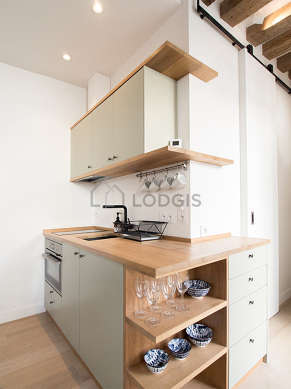 Este apartamento posee una magnífica cocina con parquet en el sueloy todo el equipamiento esencial para su vida diaria : placas eléctricas, refrigerador, horno, campana extractora, tostador, hervidor, cafetera, mesa, estantería, armario empotrado, vajilla, 1 silla(s).