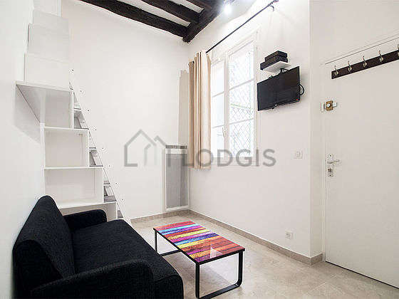 Este apartamento está formado por un salón con azulejo en el suelo y ventanas y una vista a al patio. Este salón muy tanquilo está amueblado y equipado para que su estancia sea agradable : televisor, sofá, mesita, estantería.