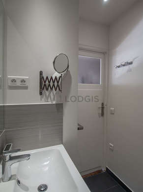 Este apartamento tiene una sala de baño magnífica y muy clara. Este baño tiene todo lo necesario para su bienestar diario : toallas, estantería, armario empotrado, ducha, sink, radiador seca-toallas. El WC está separado de la sala del baño y ubicado en un espacio independiente.