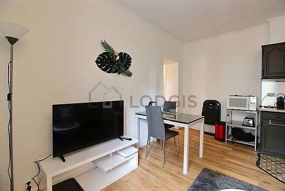 SalónEste apartamento está formado por un salón con parquet en el suelo y ventanas. Este salón muy tanquilo está amueblado y equipado para que su estancia sea agradable : televisor, sofá, mesa, mesita, estantería, 1 silla(s), tv stand.
