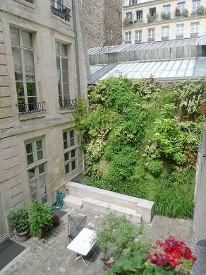 Este apartamento está formado por un salón con parquet en el suelo una vista a al patio. Este salón muy tanquilo está amueblado y equipado para que su estancia sea agradable : televisor, sofá, 1 sillones, mesa, mesita, cómoda, 1 silla(s).