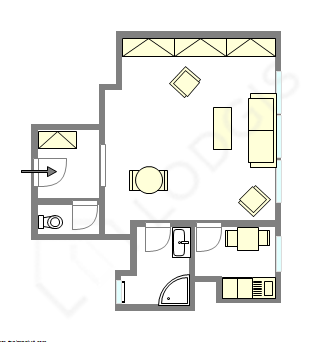 Este apartamento está formado por un salón con moqueta en el suelo y ventanas doble acristalamiento y una vista a la calle. Este salón tranquilo está amueblado y equipado para que su estancia sea agradable : televisor, sábanas, edredones, sofá, 1 sillones, mesa, mesita, estantería, aparador, armario empotrado, 1 silla(s)1 sofá cama.
