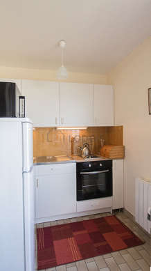 Este apartamento posee una bonito cocina con azulejo en el sueloy todo el equipamiento esencial para su vida diaria : placas eléctricas, refrigerador, horno, micro ondas, congelador, hervidor, cafetera, armario empotrado, vajilla.