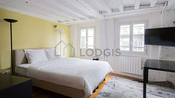 SalónEste apartamento está formado por un salón con parquet en el suelo. Este salón está amueblado y equipado para que su estancia sea agradable : televisor, sábanas, edredones, sofá, mesa, cómoda, armario empotrado, viga, 1 silla(s), mesita de noche1 cama.