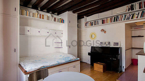 SalónEste apartamento está formado por un salón con parquet en el suelo y ventanas doble acristalamiento y una vista a al patio. Este salón muy tanquilo está amueblado y equipado para que su estancia sea agradable : televisor, mesa, mesita, estantería, armario empotrado, viga, 2 silla(s)1 cama.