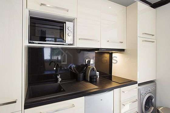 Este apartamento posee una magnífica cocina con parquet en el sueloy todo el equipamiento indispensable para su vida diaria : televisor, placas eléctricas, refrigerador, micro ondas, campana extractora, tostador, cafetera, mesa, estantería, vajilla, airer.