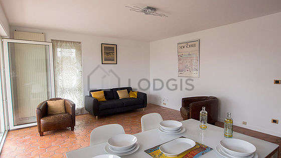 Este apartamento posee un agradable pórtico exterior con azulejo en el suelo. Es un verdadero espacio suplementario equipada con sofá, mesa, floor lamp, este pórtico hará que su estancia parisina sea todavía más cómoda en el día a día.