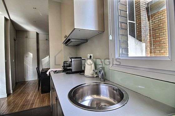 Este apartamento posee una magnífica cocina con azulejo en el sueloy todo el equipamiento necesario para su vida diaria : placas eléctricas, refrigerador, micro ondas, tostador, estantería, vajilla, taburete, bar.