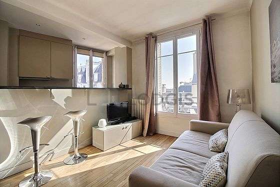 SalónEste apartamento está formado por un salón con parquet en el suelo y ventanas. Este salón muy tanquilo está amueblado y equipado para que su estancia sea agradable : televisor, sábanas, edredones, sofá, mesa de estudio, estantería, armario empotrado, 2 silla(s)1 sofá cama.