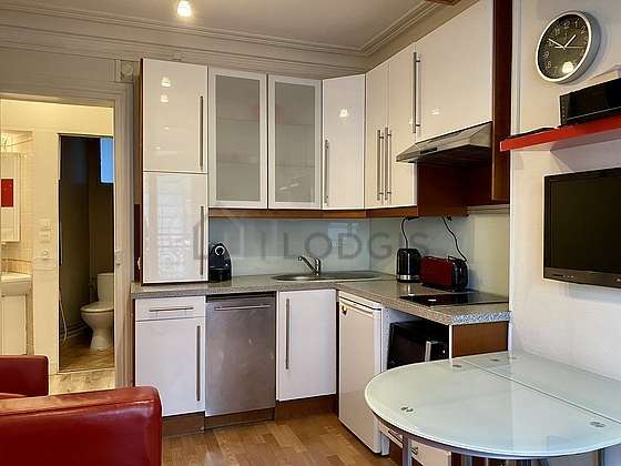 Este apartamento posee una cocina con parquet en el sueloy todo el equipamiento indispensable para su vida diaria : placas eléctricas, refrigerador, congelador, horno, horno micro-ondas, campana extractora, tostador, hervidor, cafetera, armario empotrado, vajilla.