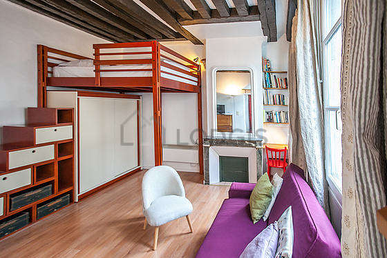 SalónEste apartamento está formado por un salón con parquet en el suelo y ventanas doble acristalamiento. Este salón está amueblado y equipado para que su estancia sea agradable : televisor, sábanas, edredones, sofá, cómoda, 1 silla(s), columnas1 cama en altura.