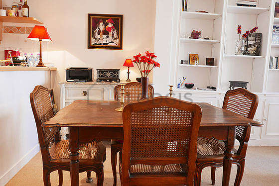 SalónEste apartamento está formado por un salón con parquet en el suelo una vista a la calle. Este salón muy tanquilo está amueblado y equipado para que su estancia sea agradable : televisor, sofá, 1 sillones, mesa, mesita, biblioteca, estantería, armario empotrado, vajilla, 1 silla(s).