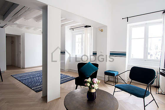 SalónEste apartamento está formado por un salón con parquet en el suelo y ventanas y una vista a la calle. Este salón muy tanquilo está amueblado y equipado para que su estancia sea agradable : televisor, 2 sillones, mesita, tv stand, carpet1 sofá cama.