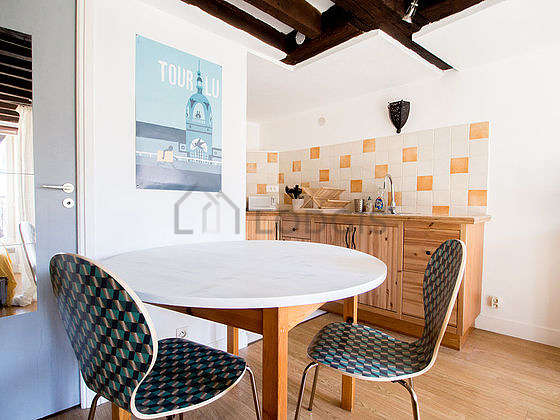 Este apartamento posee una bonito cocina con azulejo en el sueloy todo el equipamiento esencial para su vida diaria : placas eléctricas, refrigerador, horno micro-ondas, tostador, hervidor, cafetera, ropero, estantería, vajilla.