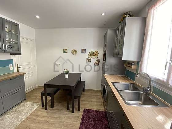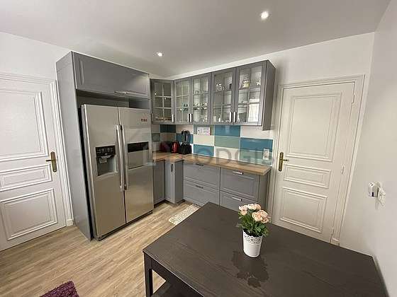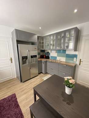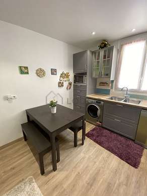 Este apartamento posee una magnífica cocina con azulejo en el sueloy todo el equipamiento necesario para su vida diaria : placas eléctricas, refrigerador, congelador, horno, micro ondas, congelador, tostador, mesa, ropero, estantería, armario, cómoda, armario empotrado, vajilla.