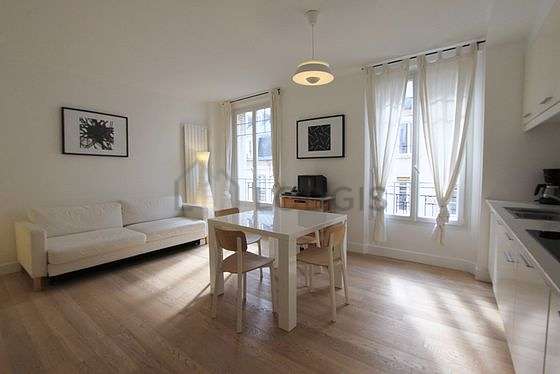 SalónEste apartamento está formado por un salón con parquet en el suelo y ventanas. Este salón muy tanquilo está amueblado y equipado para que su estancia sea agradable : televisor, sofá, mesa, estantería, 4 silla(s).