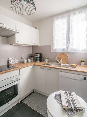 Este apartamento posee una magnífica cocina con azulejo en el sueloy todo el equipamiento necesario para su vida diaria : placas eléctricas, refrigerador, horno, micro ondas, congelador, campana extractora, cafetera, mesa, armario empotrado, vajilla, 1 silla(s).
