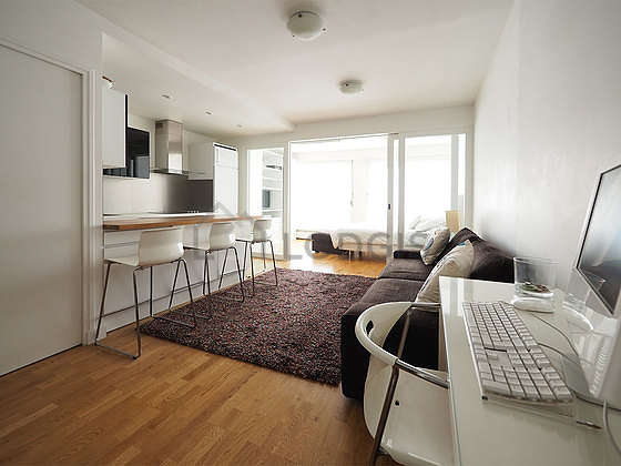 Este apartamento está formado por un salón con parquet en el suelo y ventanas. Este salón muy tanquilo está amueblado y equipado para que su estancia sea agradable : sofá, mesita, mesa de estudio, ropero, 1 silla(s), bar.