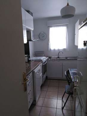 Este apartamento posee una magnífica cocina con azulejo en el sueloy todo el equipamiento indispensable para su vida diaria : placas eléctricas, refrigerador, congelador, horno, horno micro-ondas, campana extractora, tostador, cafetera, mesa, estantería, armario empotrado, vajilla, 1 silla(s), airer, mixer, towel rack, bin, painting, ventilator.