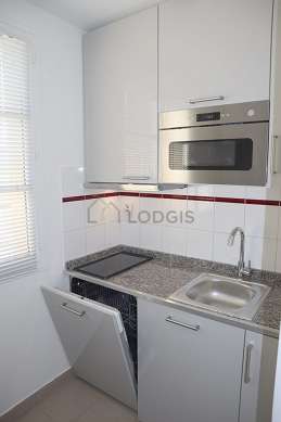Este apartamento posee una bonito cocina con azulejo en el sueloy todo el equipamiento necesario para su vida diaria : placas eléctricas, refrigerador, congelador, horno, micro ondas, campana extractora, tostador, hervidor, cafetera, mesa, armario empotrado, vajilla, 1 silla(s), taburete, floor lamp.