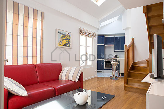 SalónEste dúplex está formado por un salón con parquet en el suelo y ventanas. Este salón muy tanquilo está amueblado y equipado para que su estancia sea agradable : televisor, sábanas, edredones, sofá, mesa, mesita, mesa de estudio, estantería, armario, cómoda, armario empotrado, vajilla, 1 silla(s)1 sofá cama.