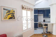 Este dúplex posee una magnífica cocina con azulejo en el sueloy todo el equipamiento necesario para su vida diaria : placas eléctricas, refrigerador, congelador, horno, micro ondas, horno micro-ondas, tostador, mesa, estantería, armario, cómoda, armario empotrado, vajilla, 1 silla(s).