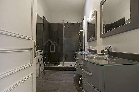 Este apartamento tiene una sala de baño magnífica y muy clara. Este baño tiene todo lo necesario para su bienestar diario : toallas, ducha, secador de pelo, sink, sink, mirror, towel rack. El WC está integrado en la sala del baño.