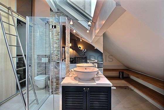 Este apartamento tiene una sala de baño magnífica y clara. Este baño tiene todo lo necesario para su bienestar diario : toallas, armario empotrado, ducha, sink. El WC está integrado en la sala del baño.