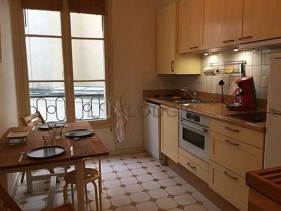 Este apartamento posee una magnífica cocina con azulejo en el sueloy todo el equipamiento indispensable para su vida diaria : placas eléctricas, refrigerador, congelador, horno micro-ondas, tostador, mesa, estantería, armario empotrado, vajilla, 1 silla(s).