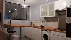 Este apartamento posee una magnífica cocina con azulejo en el sueloy todo el equipamiento indispensable para su vida diaria : placas eléctricas, refrigerador, congelador, horno, micro ondas, horno micro-ondas, congelador, mesa, ropero, estantería, armario, 1 silla(s).