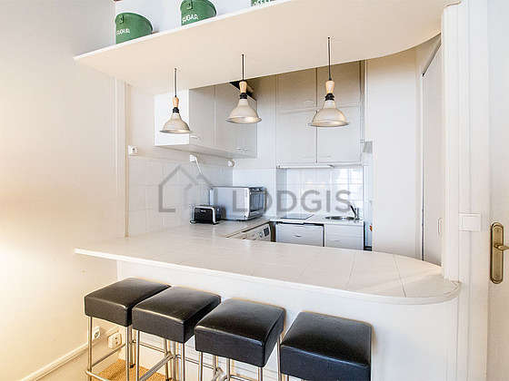 Este apartamento posee una magnífica cocina con azulejo en el sueloy todo el equipamiento esencial para su vida diaria : placas eléctricas, refrigerador, horno, campana extractora, tostador, estantería, armario empotrado, vajilla, taburete, bar.