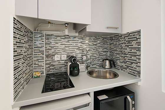 Este apartamento posee una cocinay todo el equipamiento esencial para su vida diaria : refrigerador, micro ondas, tostador, vajilla.